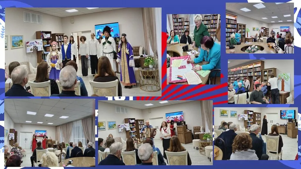 Библиотека подготовила для участников вечера обширную интерактивную программу «У нас единая страна, у нас единая семья», включающую несколько мини-акций: «Дерево дружбы» - сбор слов «мир», «друг», «семья» на языках народов нашего края, «Угадай мелодию» - мотивы известных мелодий народов России, «Ковер дружбы» - создание общего арт-объекта - большого плаката, где каждый участник добавляет свой элемент в общую композицию многонационального орнамента.