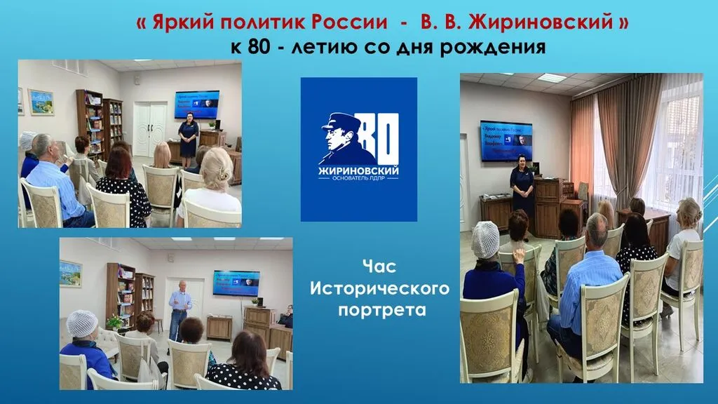 К 80-летнему юбилею Владимира Вольфовича Жириновского в Городской библиотеке №1 прошел час исторического портрета - «Яркий политик России - В.В. Жириновский», на котором присутствовали читатели библиотеки, члены клуба «Родники». Люди старшего и молодого поколения.